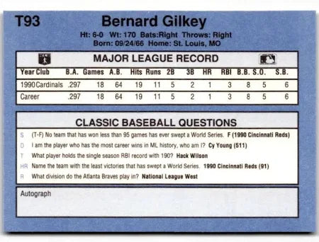 1991 Classic Bernard Gilkey Baseball Card #T93