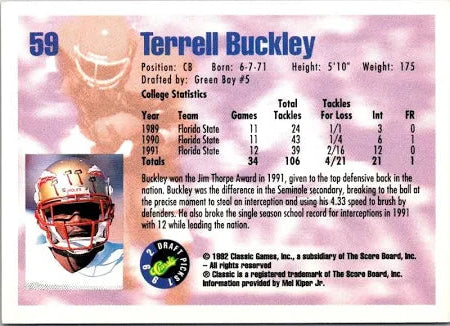1992 Classic Draft Picks Terrell Buckley Football Card #59