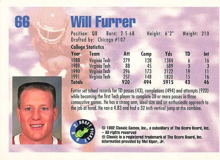 1992 Classic Draft Picks Will Furrer Football Card #66