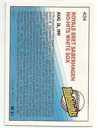 1992 Donruss Highlights Royals Bret Saberhagen No-Hits White Sox Baseball Card #434