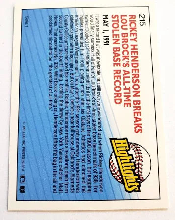 1992 Donruss Highlights Rickey Henderson Breaks Lou Brock's All-Time Stolen Base Record Baseball Card #215