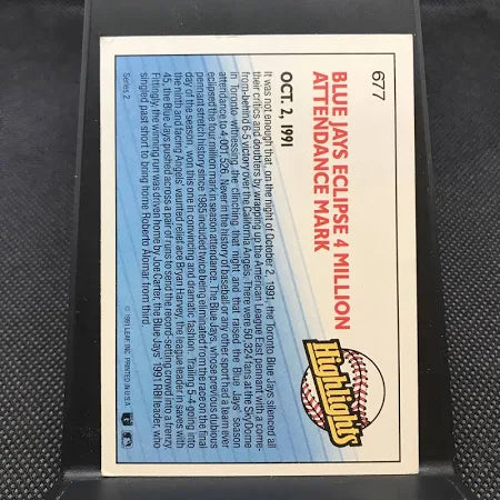 1992 Donruss Highlights Blue Jays Eclipse 4 Million Attendance Mark Oct 2, 1991 Baseball Card #677