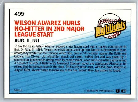 1992 Donruss Highlights Wilson Alvarez Hurls No-Hitter in 2nd Major League Start Baseball Card #495