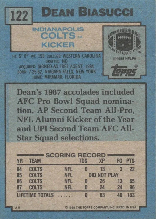1988 Topps Dean Biasucci Football Card #122