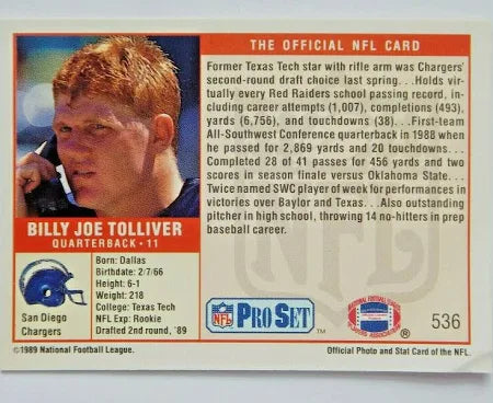 1989 NFL Pro Set Billy Joe Tolliver Baseball Card #536