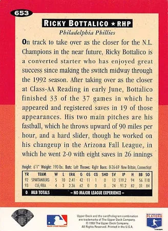 1993 Upper Deck Collectors Choice Rookie Class Ricky Bottalico Baseball Card #653