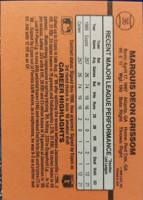 1990 Donruss Marquis Deon Grissom Baseball Card #36