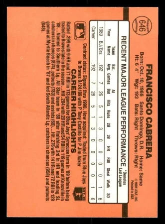 1990 Donruss Francisco Cabrera Baseball Card #646