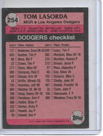 1989 Topps Tom Lasorda Baseball Card #254