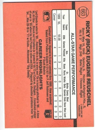1990 Donruss Ricky (Rick) Eugene Reuschel Baseball Card #663