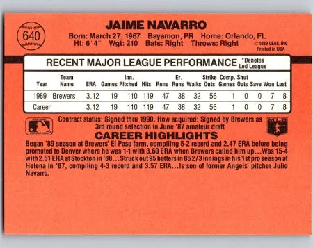1990 Donruss Jaime Navarro Baseball Card #640