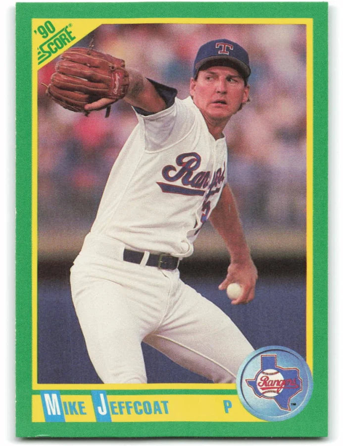 1990 Score Mike Jeffcoat Baseball Card #158 Like-New Condition. Ships USP First-Class.Mike was called up from Triple-A Oklahoma City at the end of May when Jamie Moyer went on the disabled list and became a steady fifth starter for the Rangers in '89. He gained his first major league shutout and complete game with a five-hit, 4-0 win over the Angels. Ten days later, in his fifth start, Mike, who throws a split-fingered fastball, beat the Indians 4-0 with a four-hitter. A 10-year minor league veteran, he originally was drafted by the Indians in '80, was traded to the Giants in '85 and was picked up by the Rangers in '86 after he was released.