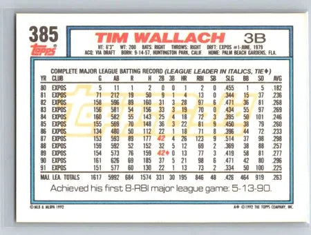 1992 Topps Tim Wallach Baseball Card #385 Like-New Condition. Ships USP First-Class.
